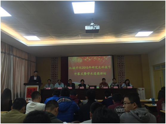 机械学院2015年研究生科技节开幕式暨学术道德讲坛在机械楼北415隆重开幕。此次活动院领导给予了高度重视,与会嘉宾有机械学院院长姚立纲教授、院党委书记李玲研究员、副院长赵云副教授、副院长向红亮教授、院党委副书记林文麟老师、院副教授张立伟老师、院团委书记夏钢老师、院团委副书记刘旭莹老师。