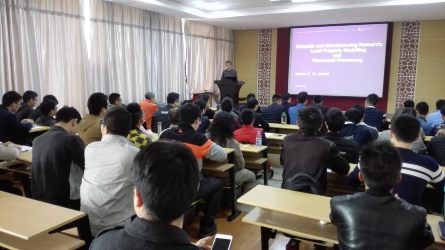 Anders E.W Jarfors教授首先用许多具体数据向同学们详细地介绍了瑞典以及延雪平大学。随后,Anders E.W Jarfors教授认真地介绍了材料和制造系,其中包括砂铸造、压铸、低压铸造、热室铸造、冷室铸造以及固体铸造这几个方面。其中,Anders E.W Jarfors教授使用了详尽的图表信息着重为同学们介绍了鲁棒和微观结构、对微观机构进行耦合特性的简单建模以及先进材料力学。在讲解的过程中,Anders E.W Jarfors教授还强调合金AM50的腐蚀性能取决于铸造技术,并且在HPDC状态下,流变金属材料表现出比AM50更好的腐蚀性能等问题。之后,他依然用图表信息清晰地给同学们讲解了具体的流变过程,其流变过程主要分为四个部分来讲解,分别是特征、厚壁部件、疲劳性能、薄壁能力、热传递性能以及流变金属加工镁合金。在课间休息时,同学们踊跃与Anders E.W Jarfors交流学习,并向Anders E.W Jarfors教授请教相关专业知识。在一番讨论交流结束后,他便给同学们讲述了本次学术讲座最重要的内容,即半固态铸造,在此期间,王连登副教授还耐心地为在场同学们翻译一些高深难懂的专有词汇。在同学们雷鸣般的掌声中,Anders E.W Jarfors教授结束了本次学术报告。