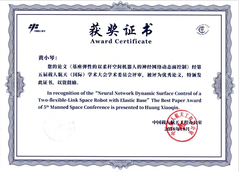 陈力老师课题组内五位同学的论文入选大会论文集,其中,博士研究生黄小琴同学提交的《基座弹性的双柔杆空间机器人的神经网络动态面控制》在大会征集的176篇主题论文中脱颖而出,入选大会优秀论文,取得了av大平台