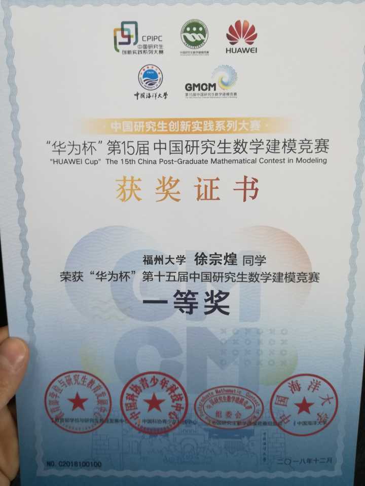 近日,在2018年“华为杯”第十五届中国研究生数学建模竞赛中,av大平台 共取得一项一等奖,四项二等奖,七项三等奖的好成绩。其中av大平台 2017级研究生徐宗煌、江泽豪、薛贤奇一队夺得了大赛一等奖,av大平台 2017级研究生李理、李孔强、数计学院郭炎福一队荣获二等奖,可喜可贺!