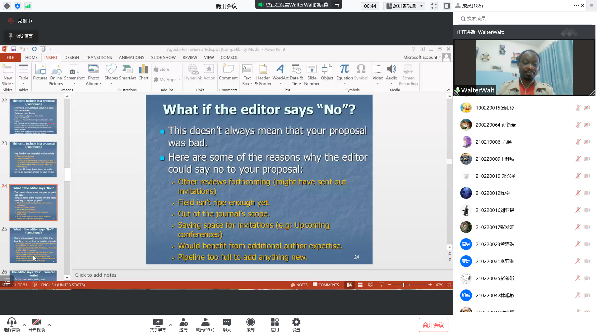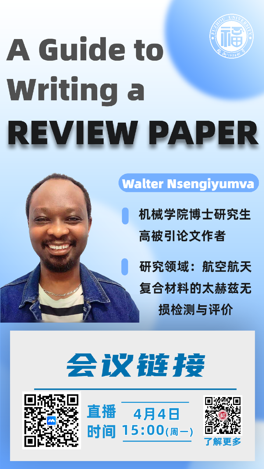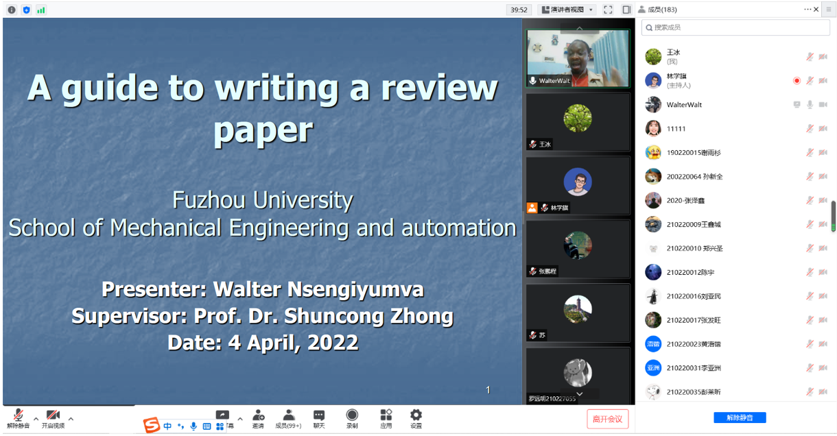 机械学院的Walter Nsengiyumva博士带来的“综述论文写作指南”专题学术报告,通过腾讯会议如期举行。报告由王冰研究员主持,180余名师生在线聆听了报告。