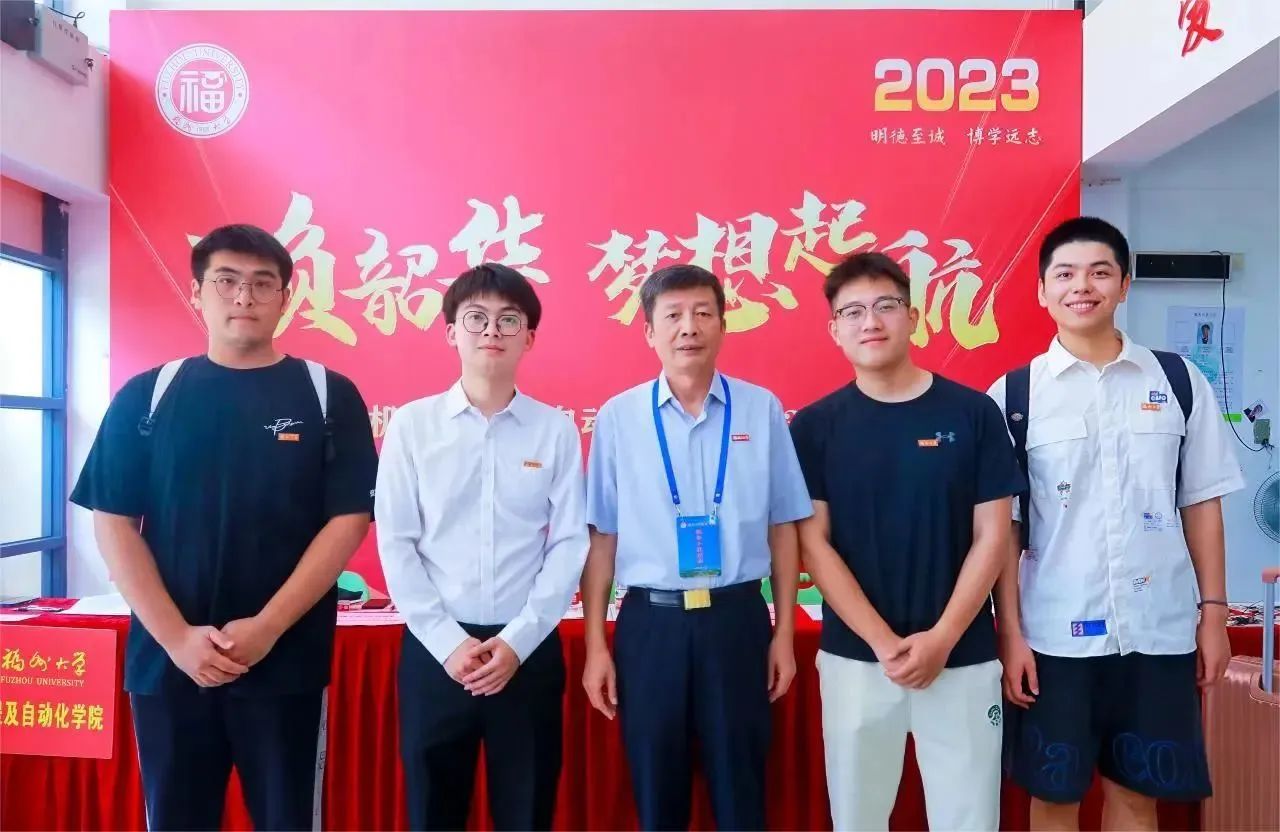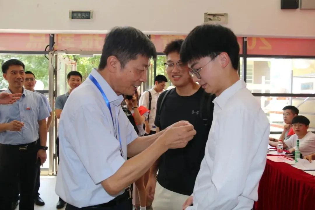 在迎新报到点,付贤智校长亲手为黄子豪、彭莱昕、黄嘉博、江文圣等四位在现场报到的新生佩戴校徽并合影留念,共同见证2023级新生开启人生的崭新阶段。