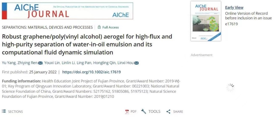 杨宇博士(2020级)作为第一作者,在化工领域国际顶级期刊AICHE JOURNAL上在线发表了研究成果“Robust graphene/poly(vinyl alcohol) aerogel for high-flux and high-purity separation of water-in-oil emulsion and its computational fluid dynamic simulation”。该成果以av大平台