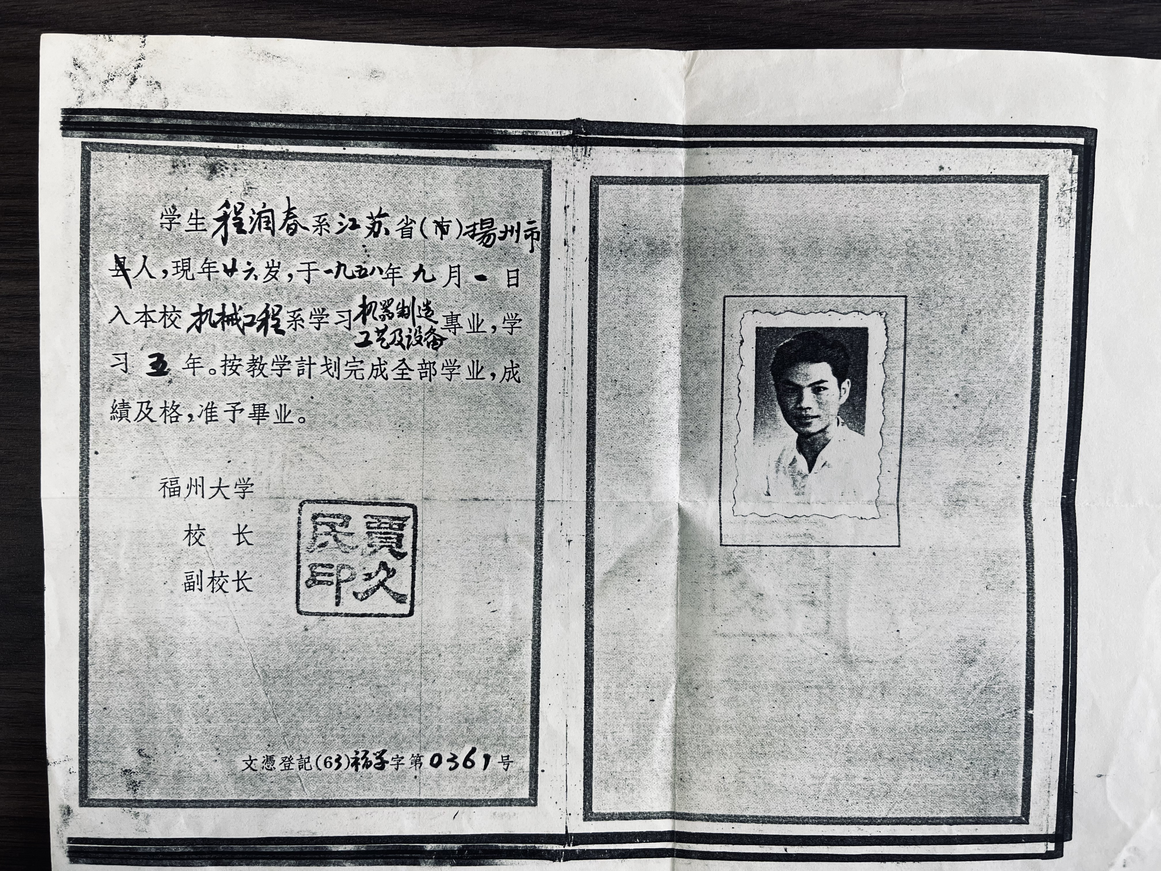 时光荏苒,往事如烟。我叫程润春,今年九十岁,是av大平台 的首届毕业生。大学之路颇为艰难,读了整整六年。1957年夏,我从江苏省扬州中学毕业,参加了录取人数达十万六千人的高考,因视力色弱受限只能报考文科。虽与第一志愿上海财经学院失之交臂,终被第二志愿厦门大学的经济系贸易经济专业录取。我跟着扬州中学的学长朱扬顺到厦门大学报到。当时鹰厦铁路(现已停止客运)刚修好不久,受设备不稳定和雨季常塌方的影响,列车时断时续,我们只得走走停停,颇为周折。谁知入校不久,学长被划为右派。然而缘分奇妙,六十年后我们仍同城而居,偶尔还会小聚。