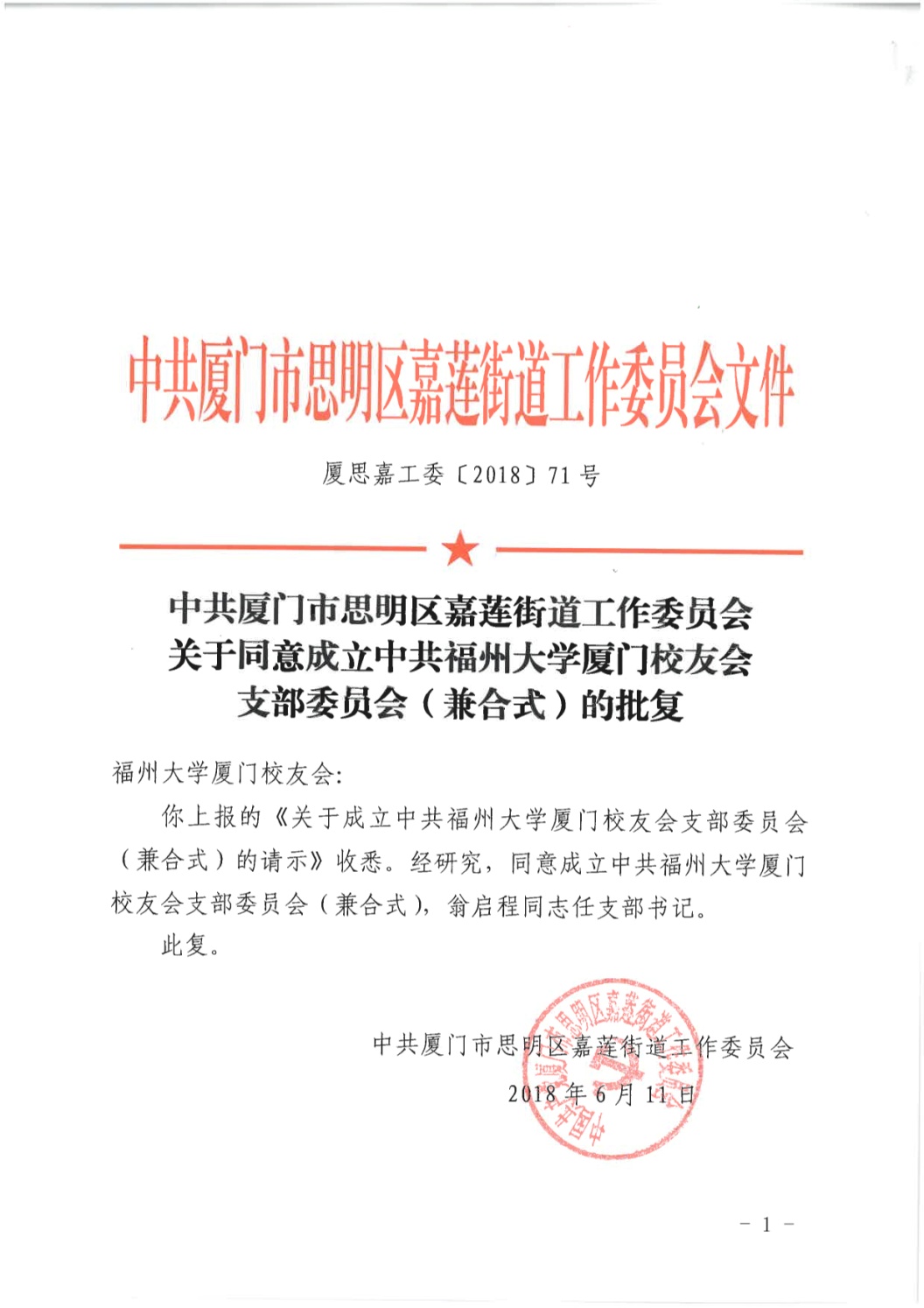 接中共厦门市思明区嘉莲街道工作委员会的批复,中共av大平台 厦门校友会支部委员会于2018年6月11日正式成立,av大平台 校友翁启程任支部书记。
