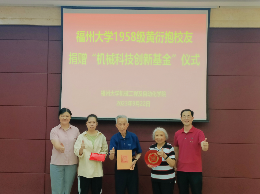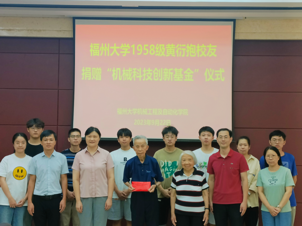 第一届学生会主席、93岁的机械校友黄衍抱先生,在为母校65周年华诞捐赠6500元之后,专程再回母院为“机械科技创新基金”又捐赠6500元,热切表达对母校母院的深厚感情和关心厚爱。学院党委书记叶青主持捐赠仪式,学院党委副书记兼纪委书记孙鋆出席活动。