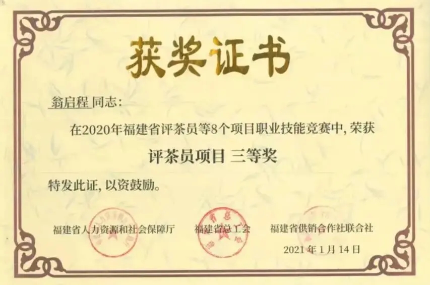 谈及此次获奖,翁启程表示:首先感谢政府相关部门的认可,国家现在大力提倡非物质文化遗产保护,作为制茶人,要不忘初心,多做好茶,多做传承,让非物质文化遗产进企业,进校园,坚定文化自信,为文化强国贡献自己的微薄之力。