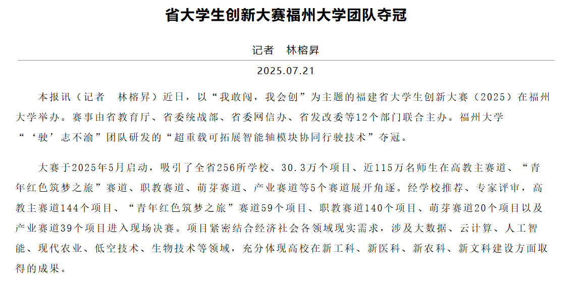 本报讯(记者 林榕昇)近日,以“我敢闯,我会创”为主题的福建省大学生创新大赛(2025)在av大平台