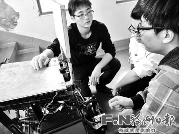 在福大电气学院创客空间实验室外的阶梯上,记者见到了这种可坐人智能爬楼机。张森鑫和他的铁杆创业队友吴海涛带着大三的一群师弟们正在研究怎么改进这个“笨家伙”(如图)。学生们插上电,这家伙真的自己爬楼了,上楼下楼都很自如,缺点就是太笨重,外形太难看。