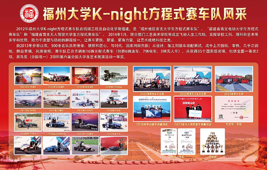 K-night方程式赛车队,是“福州地区首支大学生方程式赛车队”、“福建省首支电动大学生方程式赛车队”和“福建省首支无人驾驶大学生方程式赛车队”。自成立以来,车队自主研制了18辆赛车(包括6辆汽油机赛车、8辆电动赛车、4辆无人驾驶赛车),累计获得35个国家级奖项,包括全国一等奖2项,黑马奖(全国唯一)2项,以及全国第六届大学生艺术展演活动大学生艺术实践工作坊一等奖。车队事迹被中央电视台,中国教育电视台、福建日报、人民网、新华网、中新网等主流媒体专题报道30余篇次。