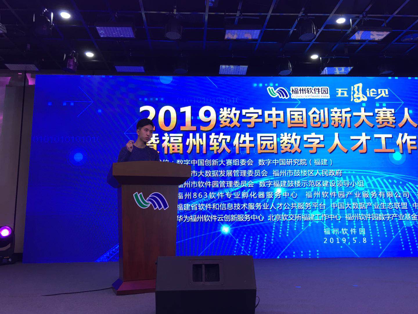 研究生、全国唯一总决赛2项一等奖获得者——黄宇星同学,代表8915位参赛选手在2019数字中国创新大赛人才合作大会上做典型发言。