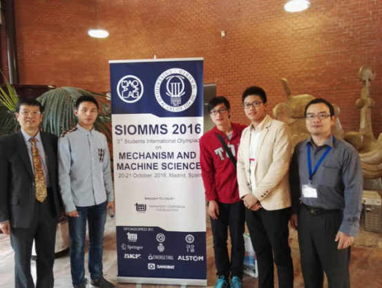 2016年10月19日至21日,第三届国际机构与机器科学大学生奥林匹克竞赛 (The third Students International Olympiad on Mechanism and Machine Science, SIOMMS 2016)在西班牙马德里卡洛斯三世大学成功举行,来自美国、俄罗斯、西班牙、德国、日本、中国等8个国家的15支代表队参加了竞赛,其中有日本的东京工业大学、德国的亚琛工业大学、俄罗斯的莫斯科国立鲍曼技术大学和我国的上海交通大学等三所“985”高校代表队。由我校机械学院2013级本科生何刚文、唐明、孙晓锋组成的av大平台 参赛队,在蓝兆辉教授、林谢昭副教授的带领下,经过顽强拼搏,从强手中脱颖而出,荣获团体总分第的好成绩,其中何刚文同学荣获个人第九名。